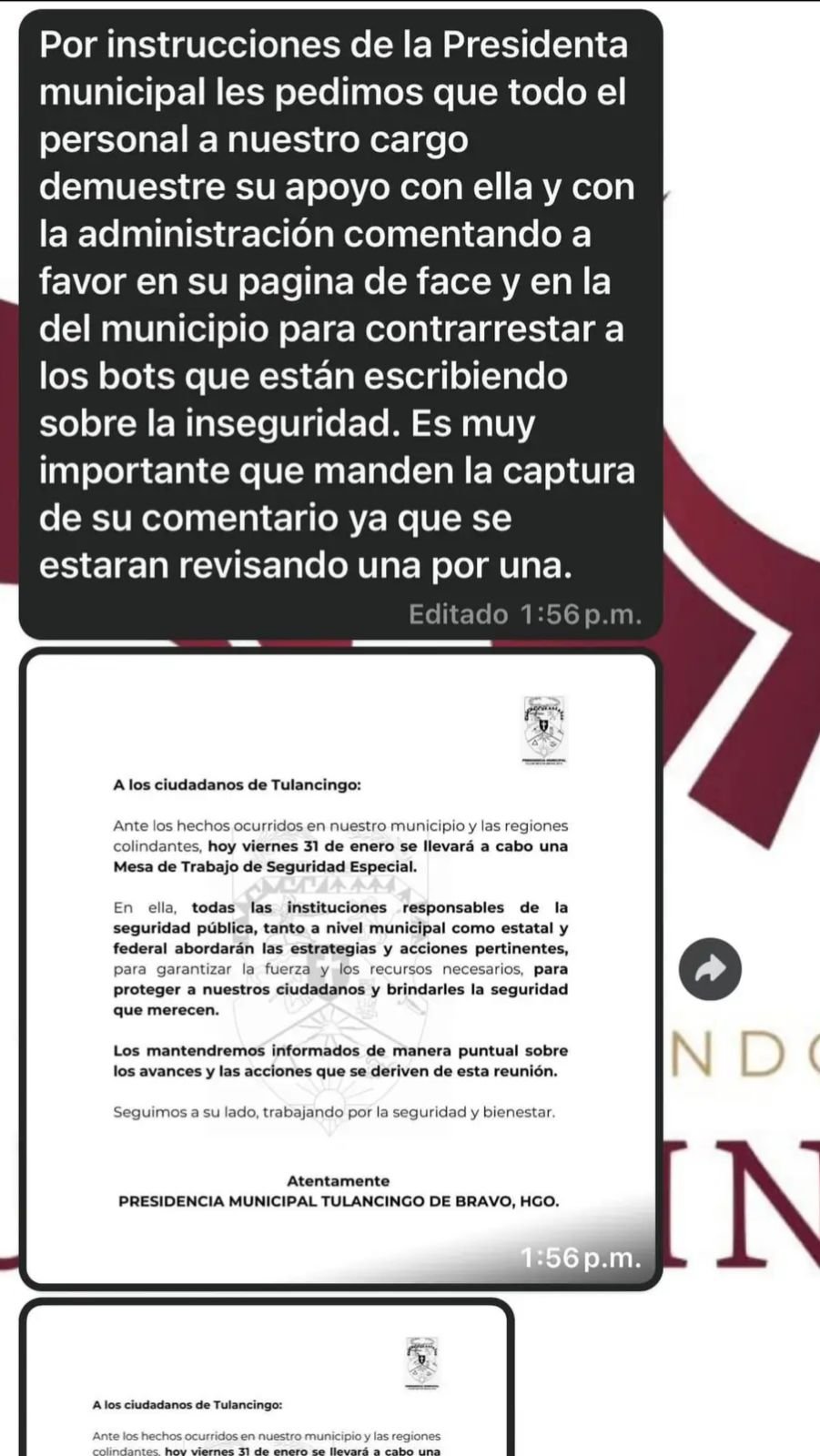 Lorena García Cazares pidió a todos los empleados de Presidencia Municipal de Tulancingo a través de un grupo de WhatsApp escribir textos y comentarios a favor de la reunión de seguridad que se tendrá el día de hoy en ese municipio, para tener la seguridad de que todos hicieron la indicación de la presidenta pidió que se les manden screenshots donde hayan publicado el comentario a favor.