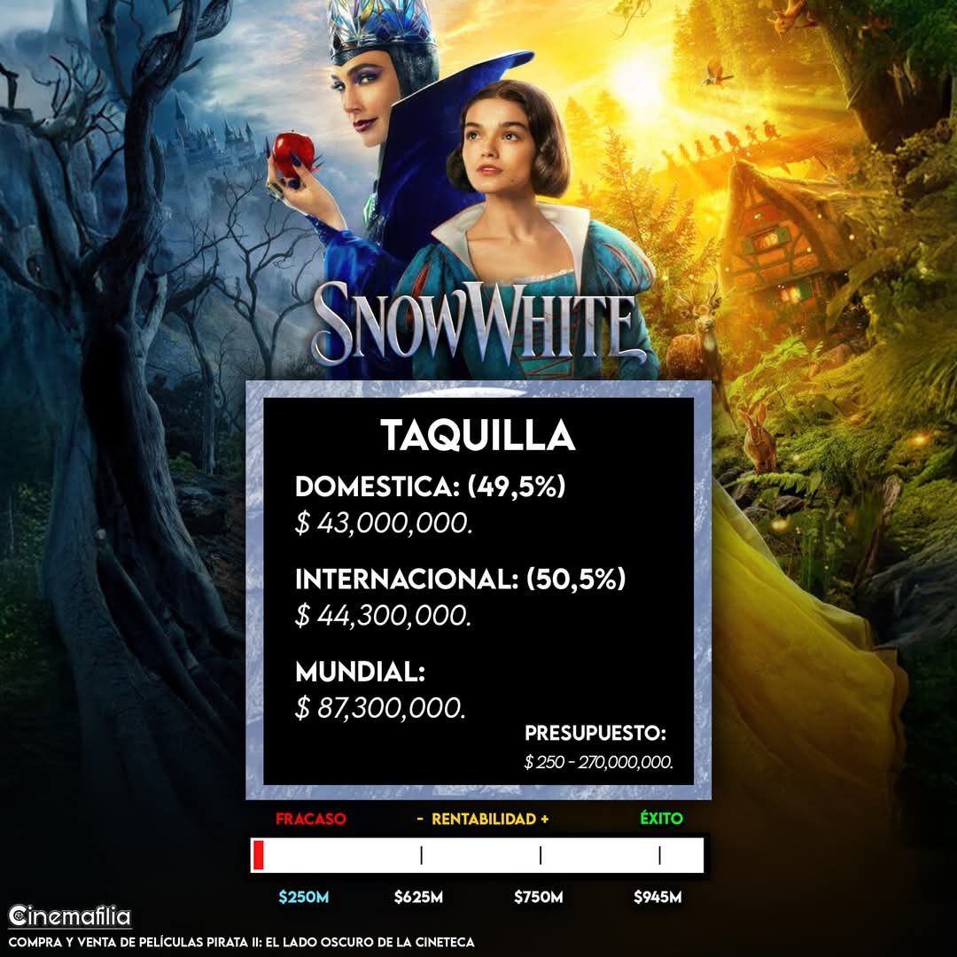 La cinta dirigida por Marc Webb y protagonizada por Rachel Zegler y Gal Gadot tuvo un inicio bastante desalentador. Se esperaba que en su primer fin de semana #blancanieves recaudara 100M a nivel mundial, pero apenas alcanzó los 87M, frente a un monumental presupuesto estimado entre 250 y 270M (según los datos más precisos de #deadline).