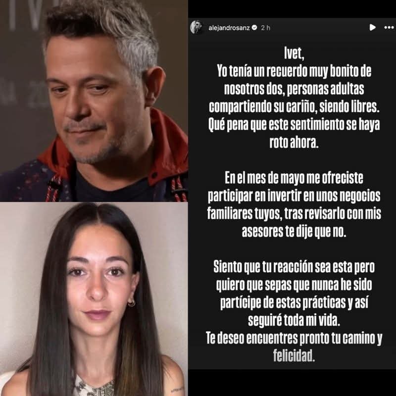 Tras el testimonio viral de Ivet Playà, quien aseguró haber vivido una “terrible pesadilla” con Alejandro Sanz, el cantante español decidió romper el silencio con un mensaje directo en sus redes. “Ivet, yo tenía un recuerdo muy bonito de nosotros dos, personas adultas compartiendo su cariño, siendo libres. Qué pena que este sentimiento se haya roto ahora”, escribió.